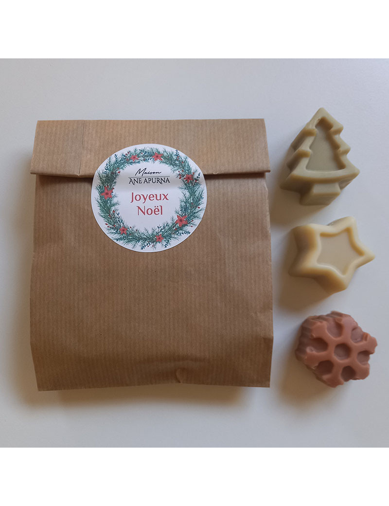 Retrouvez nos 3 formules de savons, format 15g pour Noël. 3 savons sapins emballés en sachet kraft édition de Noël, c'est LA petite attention parfaite pour un cadeau de Noël petit budget à moins de 10€.