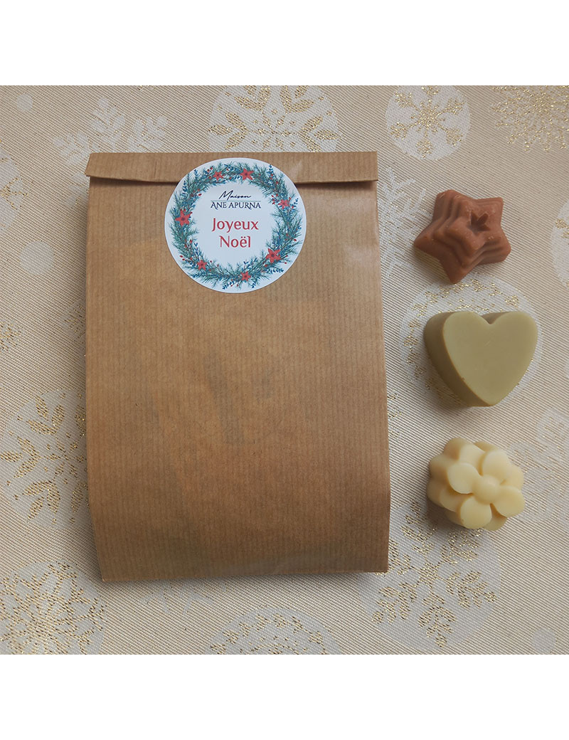 Retrouvez nos 3 formules de savons, format 15g pour Noël. 3 formes fantaisie aléatoires composent ce lot trio fantaisie emballé en sachet kraft édition de Noël, c'est LA petite attention parfaite pour un cadeau de Noël petit budget à moins de 10€.